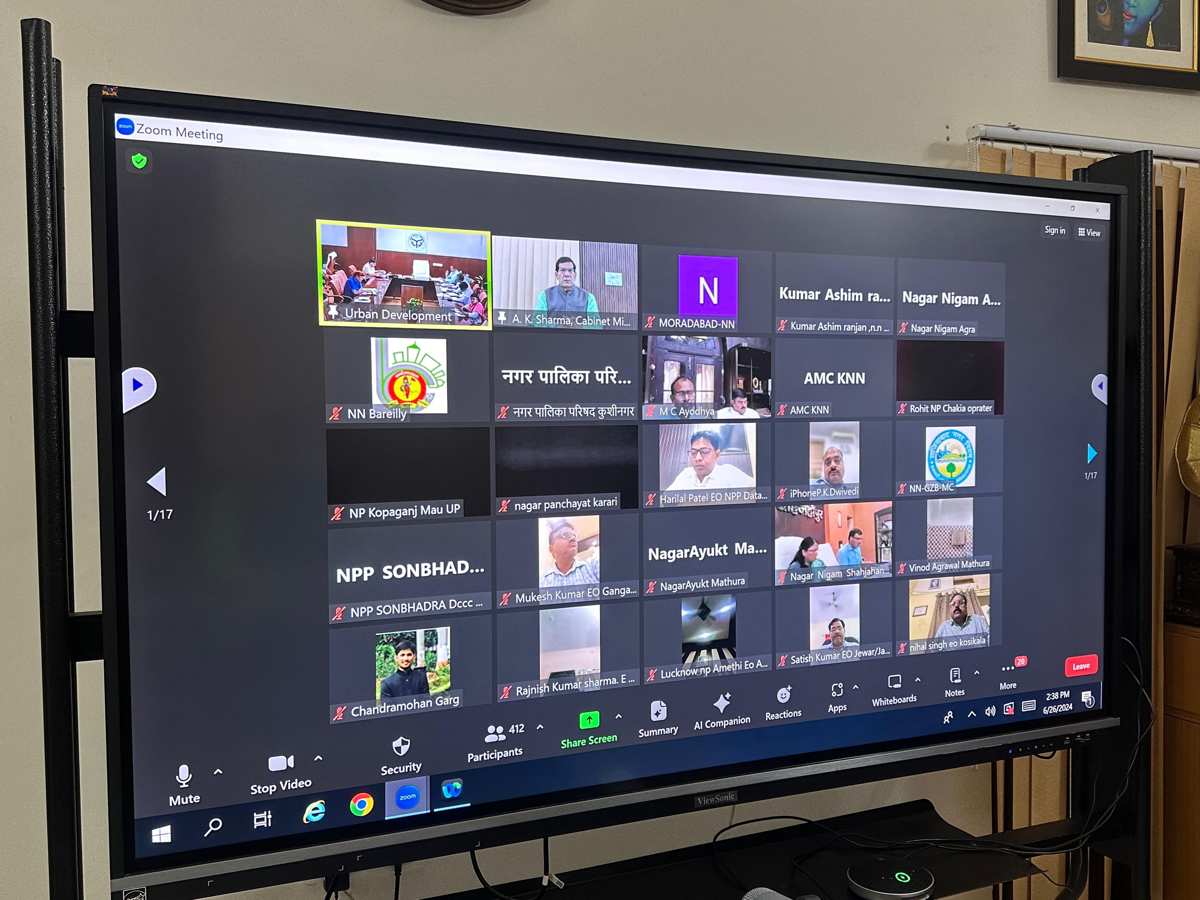 बैठक में प्रमुख सचिव नगर विकास अमृत अभिजात, सचिव अजय कुमार शुक्ल, निदेशक नगरीय निकाय नितिन बंसल तथा अन्य अधिकारियों ने निदेशालय स्थित सभागार से वर्चुअल प्रतिभाग किया तथा सभी निकायों के पदाधिकारी, नगर आयुक्त, अधिशासी अधिकारी अपने निकायो से तथा समस्त मुख्य कर निर्धारण अधिकारी, महाप्रबन्धक जल संस्थान एवं जलकल वर्चुअल जुड़े रहे।